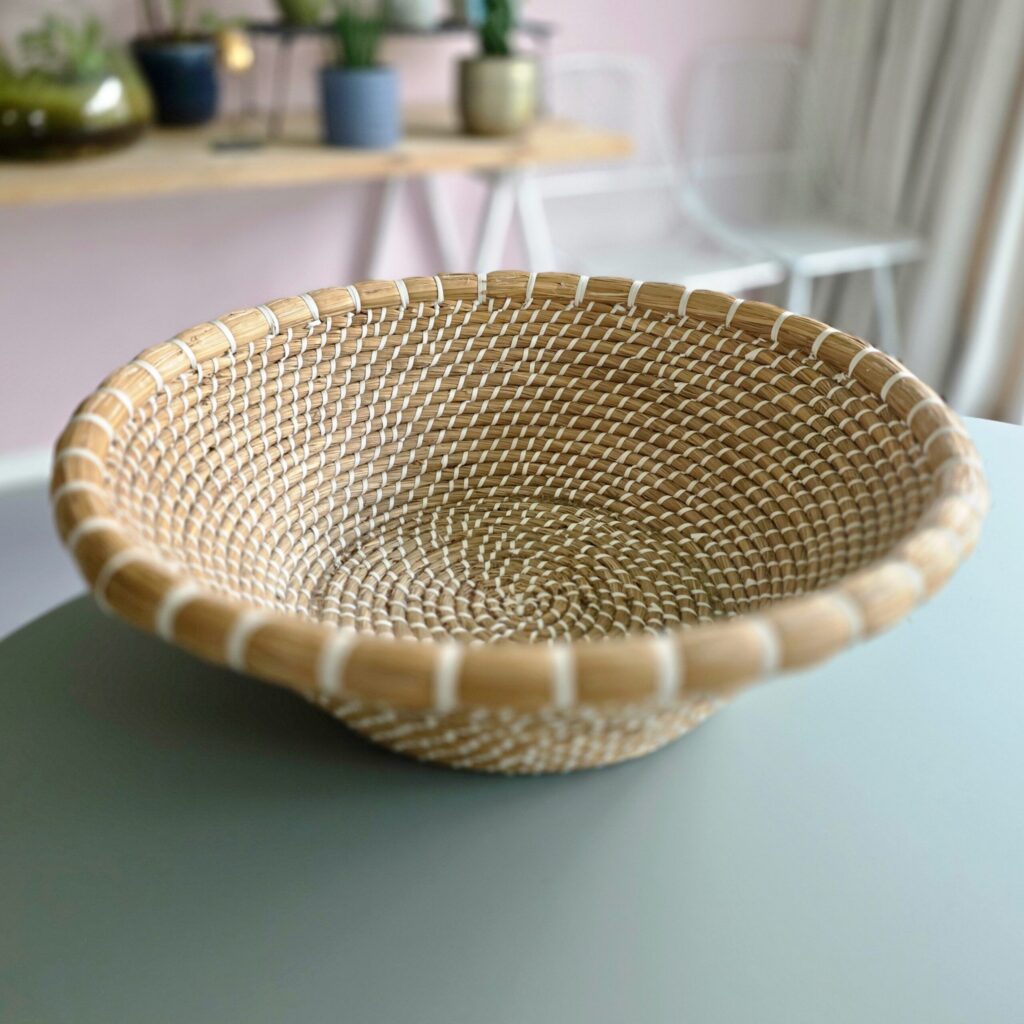 Het verschil zit vooral in het vlechtwerk. Elke streng riet is afzonderlijk verwerkt. De rand is stevig afgewerkt en gelijkmatig gevormd. Dat draagt bij aan de duurzaamheid van de schaal. Het natuurlijke materiaal veroudert op een mooie en eerlijke manier. Daardoor ontwikkelt de schaal in de loop van de tijd extra karakter.