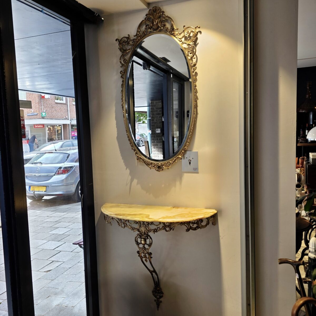Ovale spiegel met marmeren console als blikvanger