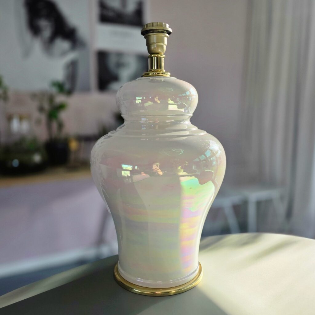 Maar wat maakt deze lampenvoet nu echt speciaal? Dat zit in de combinatie van vorm, materiaal en afwerking. De keramieken basis voelt stevig en solide aan. Tegelijk zorgt de parelmoer glans voor een subtiel en verfijnd effect. Bovendien geven de gouden details extra warmte en karakter. Daardoor past deze lampenvoet moeiteloos in verschillende woonstijlen. Denk aan brocante, vintage, modern of hotel chique.