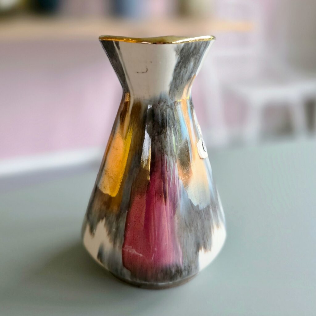 Kortom, dit vintage West Germany kannetje model 242-10 met goudrand en abstract glazuur is een uniek decoratief object. Het brengt warmte, karakter en stijl in ieder interieur. Tegelijk vertelt het een verhaal van vakmanschap, creativiteit en tijdloos design.