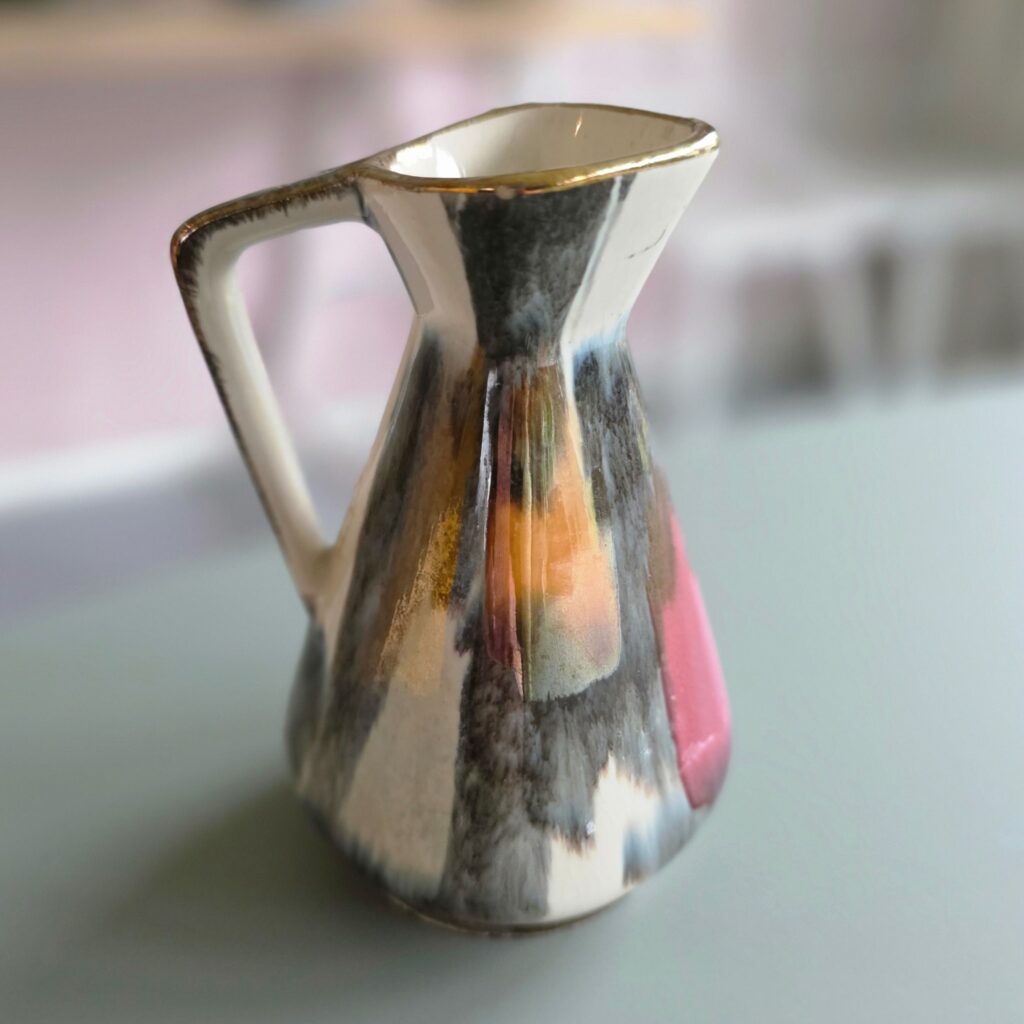 Dit bijzondere vintage West Germany kannetje model 242-10 met goudrand en abstract glazuur is een echte blikvanger. Het kannetje stamt uit de jaren 50, 60 of 70. In deze periode stond West Germany keramiek bekend om zijn expressieve vormen en opvallende glazuren. Bovendien werd elk stuk met de hand afgewerkt. Daardoor is ieder exemplaar uniek.