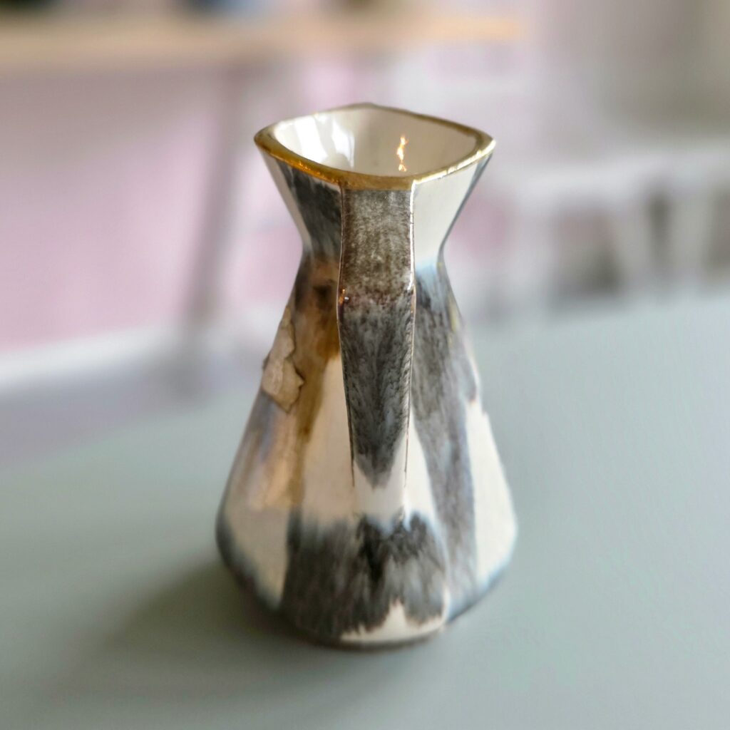 De combinatie van zachte tinten, warme kleuraccenten en subtiele glans zorgt voor een levendige uitstraling. Daarbij voegt de goudrand een verfijnd detail toe. Het elegante silhouet en het fijne oor maken het ontwerp compleet. Hierdoor past dit keramische kannetje moeiteloos binnen diverse interieurstijlen.